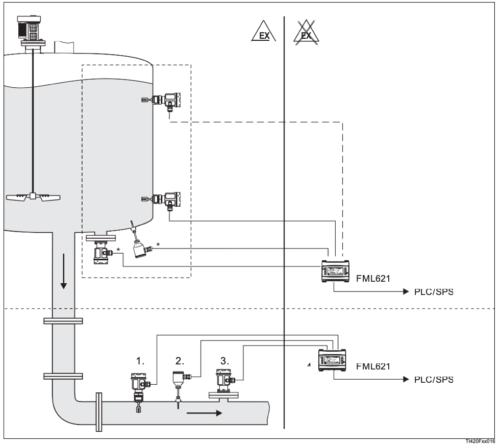3 Liquiphant M с FEL50D 3 преобразователя температуры 4...20мA 1 преобразователь давления 4...20 мA 3 выхода: плотность 4...20 мA 3 выхода: temperature 4...20 мA 1 реле для определения среды |