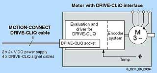 Интерфейс DRIVE-CLiQ служит для подключения датчика двигателя через интегрированный источник питания 24 В DC и передачу сигналов датчика двигателя и температуры, а также сведения об  электронной системе, например, уникальный серийный номер, номинальные значения (напряжение, сила тока, крутящий момент)  на Блок управления. Это означает, что для датчиков разных видов - например, резольвер или абсолютный датчик – не требуются различные кабели различной длины, используется кабель одного вида - MOTION-CONNECT. DRIVE-CLiQ – для всех датчиков. Эти двигатели значительно облегчают ввод в эксплуатацию и диагностику, так как двигатель и тип датчика определяются автоматически.