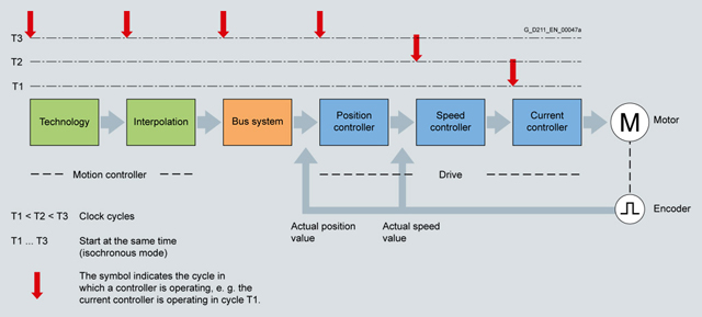 Большинство современных приводов поддерживают цифровой контроль по обратной связи. Этот контроль по обратной связи гарантирует, что необходимые управляемые переменные привода, например, скорость или местоположение, достигаются и поддерживаются. Этот тип цифрового контроля по обратной связи состоит из нескольких взаимосвязанных элементов управления (местоположение, скорость, ток и т.д.). Они должны быть соотнесены с друг другом, т.е. синхронизированы. Эта синхронизация имеет большое значение для стабильной работы элементов управления и достижения и/или поддержания управляемых переменных значений. Если определенные компоненты контроля по обратной связи находятся вне привода, необходимо использовать систему шин для управления связью между этими компонентами. Эта система шин должна быть так же синхронизирована, как и контроль по обратной связи. Такой режим работы называется астатическим. Для приводов в области систем контроля движений астатический режим работы должен быть особенно быстрым и точным. Это гарантирует наличие только небольших отклонений в цикле шины. При этом такой режим работы называется не модуляцией цикла шины (большие отклонения), а флуктуацией (небольшие отклонения). Приемлемыми являются значения <1 µs. Это синхронизация реализуется с помощью тактовых сигналов.