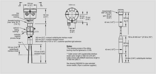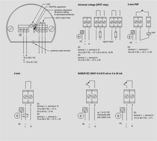 Технические данные Принцип работы | | Принцип измерения | Вибрационный сигнализатор предельного уровня | Вход | | Измеряемая величина | Мин. и макс. | Выход | | Выходной сигнал | | задержка срабатывания реле | около 1 сек. С момента прерывания вибрации 1 до 2 сек. С сосента возобновления вибрации | релейный failsafe | переключатель | выход тревоги | | Чувствительность | Мин. Или макс. Выбор через переключатель | Условия использования | | Условия монтажа | | указания по монтажу | внутриснаружи | Внешние условия | | внешняя температура | -20 to +60 °C (-4 to +140 °F) | класс защиты | IP 65 / Type 4 / NEMA 4 | категория монтажа | III | Свойства измеряемого вещества | Сыпучие вещества | температура | -20 to +80 °C (-4 to +176 °F) | давление (резервуар) | макс. 10 Бар (145psi) Европейское труководство по устройствам под давлением 9723ЕС категория 1 | мин. насыпной вес | 20 гл (1,3lbft3) | частота измерения | около 125 Гц | Конструктивные особенности | | материал | | корпус | Алюминий с эпоксидным покрытием | сенсор | Нержавеющая сталь | Подсоединение к процессу | Резьба 112 дюйма NP{T, R 112 дюйма DIN 2999 (коническая) | Ввод кабеля | 2 х М20 order 12 дюйма NPT | Вес | около 1,9 кг + 2,5 кгм удлинительной трубки | Вспомогательная энергия | 19 to 230 Vac, +10%, 50 to 60 Hz, 8 VA DC 19 to 55 V, +10%, 1.5 W АС 19 до 230 V, + 10%, 50 до 60 Гц, 8 VA или DC 19 до 55 V, + 10%, 1,5 W | Сертификаты и джопуски | FM/CSA Class II, Div. 1, Group E, F, G, Class III CSAUS Class II, Div. 2, Class III ATEX II 1/2 D (dust explosion) CE FMCSA класс II, Div. 1, группы E, F, G класс III CSA класс II, Div. 2 класс III ATEX II 12 D (пылевзрывозащита) СЕ | |