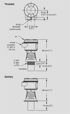 ДизайнМонтаж Монтаж сигнализатора предельного уровня POINTEK ULS 200 необходимо производить в местах, где температура не превышает максимально допустимого уровня. В соответствии с хараетеристиками класса защиты и материала корпуса. Крышка должна быть доступной, чтобы обеспечить подсоединение, калибровку и обзор дисплея. Рекомендуется не производить монтаж сигнализатора предельного уровня POINTEK ULS 200 в непосредственной близости от высоковольтных и частотных преобразователей или силовых выключателей. При монтажа необходимо учитывать, что ультразвуковой луч должен не иметь на пути препятсвий и быть направлен под прямым углом к поверхности материала. Монтаж и подключение Имеется три типа резьб Pointek ULS 200 : 2" NPT, 2" BSP или PF2 . Сигнализатор предельного уровня может быть снабжен фланцевым адаптеромl 75 mm (3") в качестве ответного фланца к фланцамo 3" ANSI, DIN 65, PN10 и JIS 10K 3B. Для обеспечения соответствующих технических условий может возникнуть необходимость раздельной прокладки кабелей и и линий. |