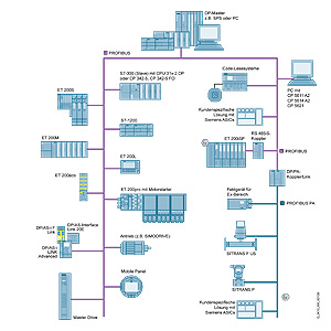 Протокол PROFIBUS-DP отвечает требованиям стандартов IEC 61158 и EN 50170 и ориентирован на организацию скоростного циклического обмена небольшими объемами данных между активными (Master) и пассивными (Slave) сетевыми устройствами. Функции активных устройств выполняют системы автоматизации, устройства и системы человеко-машинного интерфейса, обслуживающие системы. В качестве пассивных устройств используются станции распределенного ввода-вывода SIMATIC ET 200, а также аппаратура полевого уровня с встроенными интерфейсами PROFIBUS-DP (датчики, регуляторы, преобразователи частоты, устройства плавного пуска, коммутационная аппаратура и т.д.). Помимо циклического (синхронного) обмена между активными и интеллектуальными пассивными устройствами поддерживается асинхронный обмен данными, используемый для передачи параметров настройки, диагностической информации и т.д.