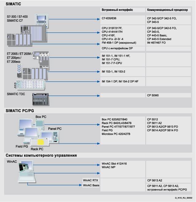 PROFIBUS-DP: Протокол PROFIBUS-DP отвечает требованиям стандартов IEC 61158 и EN 50170 и ориентирован на организацию скоростного циклического обмена небольшими объемами данных между активными (Master) и пассивными (Slave) сетевыми устройствами. Функции активных устройств выполняют системы автоматизации, устройства и системы человеко-машинного интерфейса, обслуживающие системы. В качестве пассивных устройств используются станции распределенного ввода-вывода SIMATIC ET 200, а также аппаратура полевого уровня с встроенными интерфейсами PROFIBUS-DP (датчики, регуляторы, преобразователи частоты, устройства плавного пуска, коммутационная аппаратура и т.д.). Помимо циклического (синхронного) обмена между активными и интеллектуальными пассивными устройствами поддерживается асинхронный обмен данными, используемый для передачи параметров настройки, диагностической информации и т.д.