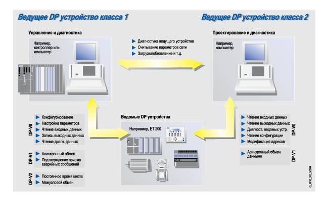 Ведущие устройства класса 1: Ведущие сетевые устройства класса 1 осуществляют управление циклическим обменом данными с ведомыми сетевыми устройствами. Помимо скоростного циклического обмена данными ведущие устройства класса 1 способны поддерживать асинхронный обмен. Асинхронный обмен используется для передачи параметров настройки или результатов измерений ведомых устройств и имеет более низкий приоритет по сравнению с циклическим обменом. Функции ведущих сетевых устройств класса 1 могут выполнять программируемые контроллеры SIMATIC S7-300/S7-400, системы автоматизации SIMATIC C7, промышленные компьютеры и т.д.