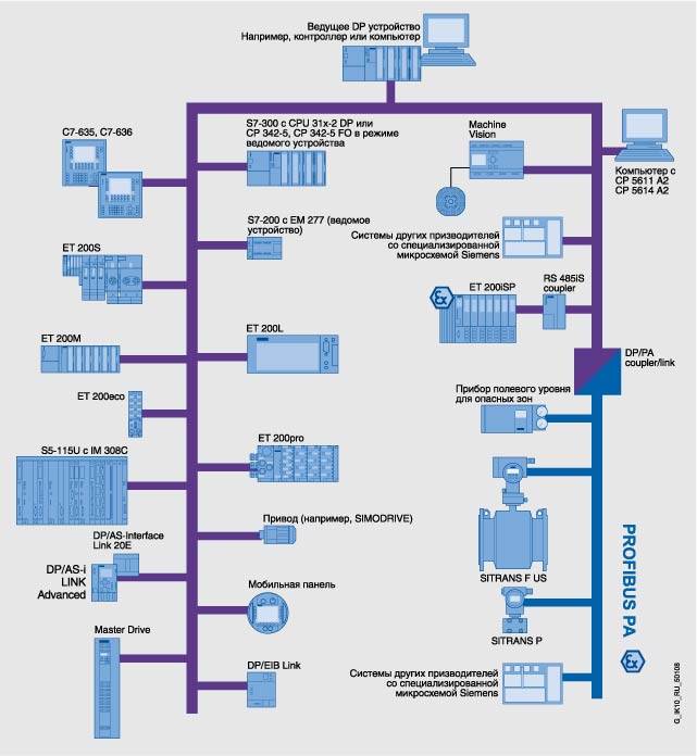 PROFIBUS – это мощная открытая сетевая система с коротким временем цикла, отвечающая требованиям международных стандартов IEC 61158 и EN 50170. Для связи с полевым уровнем она позволяет использовать два протокола: PROFIBUS-DP и PROFIBUS-PA.