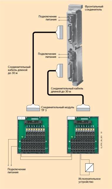 ДизайнФронтальный соединительФронтальный соединитель устанавливается на дискретный или аналоговый модуль контроллера вместо стандартного фронтального соединителя. Каждый фронтальный соединитель оснащен двумя (для 16-канальных модулей) или четырьмя (для 32-канальных модулей) разъемами для подключения ленточного соединительного кабеля, а также двумя или четырьмя терминальными блоками для подключения цепей питания. Терминальные бдокиТерминальные блоки оснащены разъемом для подключения ленточного соединительного кабеля SIMATICTOPConnect а также набором клемм для подключения внешних цепей контроллера (цепей датчиков и приводов). Каждый терминальный блок позволяет производить подключение до 8 сигнальных цепей. В зависимости от модификации терминальные блоки могут иметь контакты с винтовыми зажимами или пружинные контакты-защелки. Все терминальные блоки монтируются на стандартную 35мм профильную шину DIN. Соединительные кабелиЛенточные соединительные кабели используются для подключения фронтальных соединителей SIMATICTOPConnect к терминальным блокам. Для этой цели используется ленточный кабель 1х16 жил (обычный или экранированный) или 2х16 жил (обычный) с одним или двумя плоскими соединителями на каждом конце. Ленточный кабель помещен в защитную оболочку, повышающую стойкость кабеля к внешним воздействиям. Конструкция плоского соединителя позволяет регулировать длину соединительного кабеля. Для подключения жил ленточного кабеля к контактам плоского соединителя используется метод прокалывания изоляции. Максимальная длина соединительного кабеля может достигать 30м. Применение плоских кабелей с круглой оболочкой дают следующие преимущества: