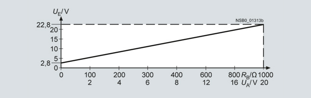 Следующий график показывает изменение напряжения на входе UE в зависимости от нагрузки RB с учетом потери напряжения UV. Если нагрузка известна, ось "y" показывает минимальное напряжение, которое должно быть подано на источник тока с учетом наибольшего тока 20 мА через пассивный разделитель и нагрузку.