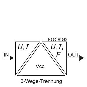 При 2-кратном гальваническом разделении вход электрически изолирован от выхода. "Нулевой потенциал" питающего напряжения такой же, как опорный потенциал для аналогового выходного сигнала.
