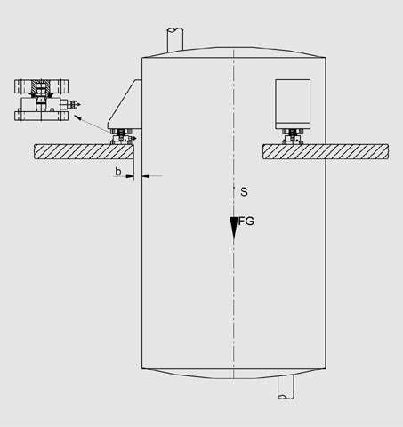 В качестве монтажных компонентов используются самоцентрирующиеся качающиеся опоры, т.к. речь идет о висящей емкости, которая не может подниматься с опоры. По причине повышения температуры на 37 K диаметр емкости увеличивается на 0,4 мм. Качающаяся опора рассчитана на максимальное отклонение в ±4 мм и, таким образом, в состоянии компенсировать тепловое расширение емкости. Ограничение качания не требуется, т.к. между емкостью и платформой имеется небольшой зазор шириной b = 3 мм. В этом случае платформа выполняет функции ограничителя качания. Если в конкретной ситуации ширина зазора больше, необходимо проверить, не требуется ли применение комбинированных монтажных блоков (вместо качающейся опоры) или внешних ограничителей качания (см. пример проектирования 4). Конфигурация для взвешивания емкостей (базовая)