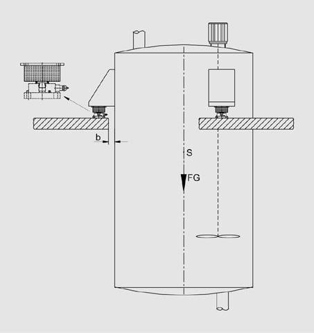 В качестве монтажных компонентов используются самоцентрирующиеся эластомерные опоры, чтобы минимизировать вибрацию, исходящую от мешалки. Эластомерная опора допускает максимальный ход качания ± 4 мм. Ограничение качания не требуется, т.к. между емкостью и платформой имеется небольшой зазор шириной b = 3 мм. Если в конкретной ситуации ширина зазора больше, необходимо установить упоры или внешние ограничители качания (см. проект 4).