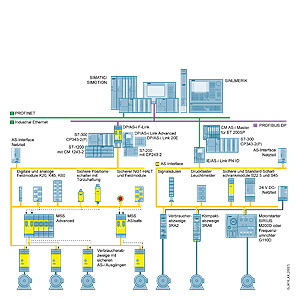 AS-интерфейс применяется там, где отдельные исполнительные механизмы и датчики пространственно распределены на установке (например, линии разлива, конвейеры).AS-нтерфейс заменяет кабельные линии и соединяет дискретные и аналоговые исполнительные механизмы и датчики, например, пускатели, вентили, светоиндикацию, управляемые от SIMATIC или PC.