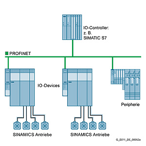 С SINAMICS PROFINET поддерживает реализацию различных структур автоматизации. Распределенные управляемые приводами системы контроля движения (например, с SIMOTION D) или центральные архитектуры с контролем (например, SIMOTION P) поддерживаются тем же способом, что и распределенные решения автоматизации с модульными компонентами автоматизации.