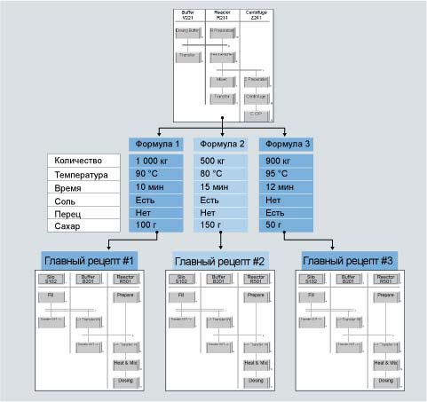The flexibility achieved by recipes which are independent of specific units can be increased even further if the procedure and parameter sets (formulas) are separated from one another. Various master recipes can be created by linking several formulas using a recipe procedure. This enables central modification of procedures. The formula structure is determined by the formula category defined by the user.