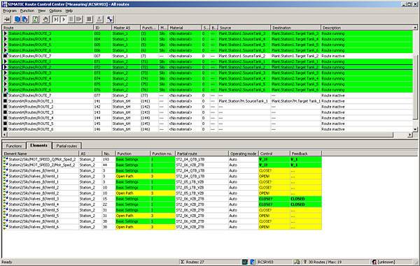 ФункцииRoute Control Server Route Control Server предоставляет RC клиентам всю необходимую инфорамцию и переносит команды с них в системы автоматизации. Когда с клиента производится запрос на исполнение транспортного пути, эта задача динамически компилируется на сервере для формирования полного пути из различных возможных частей , который были сконфигурированы в системе автоматизации на базе узловых параметров (источника, назначения, промежуточных положений) и специальных параметров (тип материала, тип функции и тд). Изменения в конфигурации восприниматся немедленно в зависимости от подходящего траспортнго пути. Route Control Center (RCC) RCC может быть вызван как из панели отображения блока, так и из стартового меню. В окне отображаются все данные относящиеся к траспортным путям и информация об ошибках. Дополнительно возможен вывод следующих данных: - Обзор всех RC элементов и их деталировка.