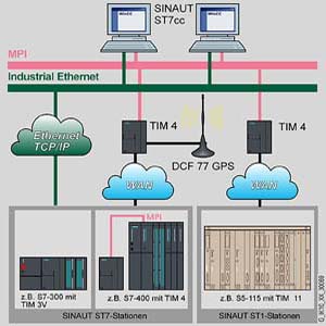 Хотя бы один из модулей TIM должен быть оснащен приемником сигналов точного времени DCF77. Этот модуль используется для синхронизации времени компьютерного центра управления и всех SINAUT станций. Синхронизация времени SINAUT сети из ST7cc невозможна.Вне области приема сигналов DCF77 рекомендуется использовать GPS приемник, получающий сигналы точного времени через систему спутниковой связи.