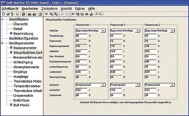 Программное обеспечение Soft Starter ES 2006 Smart используется для включения, параметризации, диагностики и документирования данных устройства плавного пуска SIRIUS 3RW44 для широких и сложных применений. Доступ к устройству осуществляется при помощи ПК или специального программатора и специального кабеля посредством последовательного интерфейса. При использованиии ПО Soft Starter ES 2006 Smart, устройство плавного пуска SIRIUS 3RW44 легко параметризуется перед началом работы, отслеживаются данные при нормальной работе устройства и удобно осуществляется диагностика для сервисных функций. Необходимые параметры могут быть легко установлены в ПК, а затем легко переданы в устройство плавного пуска при его включении. Программа имеет следующие основные функции: