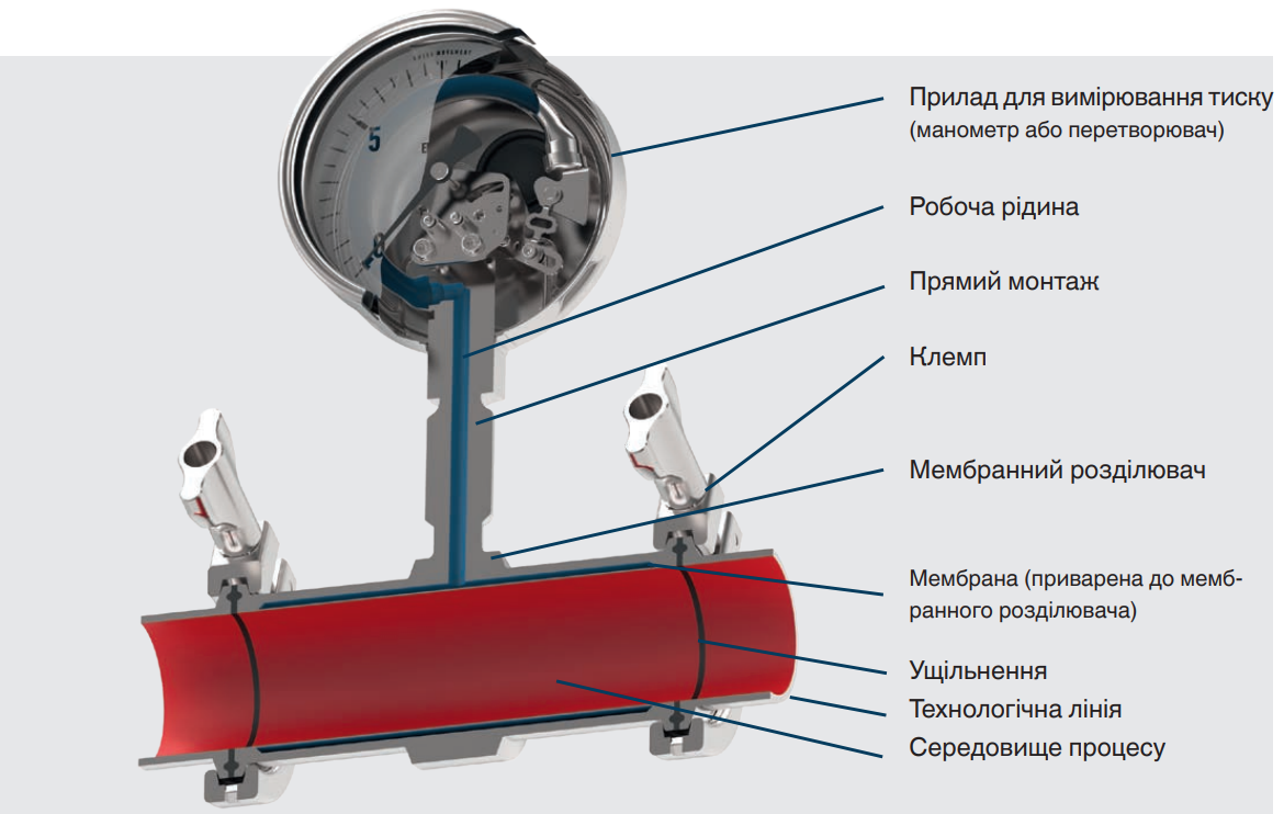 Прилад для вимірювання тиску, (манометр або перетворювач),Робоча рідина Прямий монтаж Клемп Мембранний розділювач Мембрана (приварена до мембранного розділювача) Ущільнення Технологічна лінія Середовище процесу