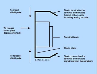 Экран экранированного сигнального кабеля можно соединить с землей на аналоговом модуле через зажим для присоединения экрана и на клеммном блоке через щиток для присоединения экрана. Экран сигнальных кабелей или плоского кабеля в круглой оболочке можно соединить с землей непосредственно на клеммном блоке. Для этого перед монтажом закрепите на клеммном блоке щиток для крепления экрана. На рисунке Вы видите, что этот щиток находится на задней стороне клеммного блока, обеспечивая соединение с заземленной профильной шиной. Экран сигнальных кабелей или плоского кабеля в круглой оболочке закрепите на щитке с помощью клемм для присоединения экрана.