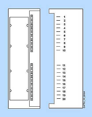 | Вывод плоского кабеля в круглой внешней оболочке (соответствие см. на изображении 40-контактного аналогового штекерного модуля) | Соответствие клеммного блока 40-контактному аналоговому штекерному модулю |