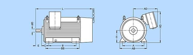 Чертеж Конструкция: Тип IM B3, подшипники качения, степень защиты IP55, метод охлаждения IC 441 | Тип | Вес | A | AB | AD | B | BB | C | H | HD | L | D | E | | | примерно, кг | mm | mm | mm | mm | mm | mm | mm | mm | mm | mm | mm | | 4-полюсные | | 1LA8315-4AB.0 | 1300 | 560 | 680 | 570 | 630 | 780 | 180 | 315 | 825 | 1410 | 85 | 170 | | 1LA8317-4AB.0 | 1500 | 560 | 680 | 570 | 630 | 780 | 180 | 315 | 825 | 1410 | 85 | 170 | | 1LA8353-4AB.0 | 1900 | 630 | 780 | 710 | 800 | 980 | 200 | 355 | 905 | 1635 | 95 | 170 | | 1LA8355-4AB.0 | 2000 | 630 | 780 | 710 | 800 | 980 | 200 | 355 | 905 | 1635 | 95 | 170 | | 1LA8357–4AB.0 | 2200 | 630 | 780 | 840 | 800 | 980 | 200 | 355 | 945 | 1635 | 95 | 170 | Дальнейшая информация в Каталоге M 11 (Заказной номер E86060K1711A101-A3-7600 англ.). |