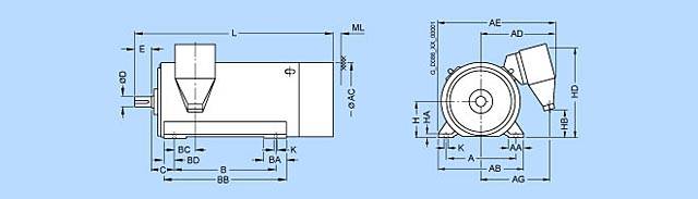 ЧертежКонструкция: Тип IM B3, подшипники качения, степень защиты IP55, тип охлаждения IC 441