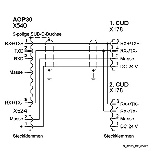 Распределение кабеля RS485 при использовании двух CUD (24 V источник питания от одного CUD) – макс.длина кабеля 50 м