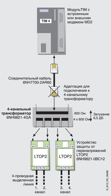 ИнтеграцияМногообмоточный разделительный трансформатор позволяет производить параллельное подключение к одному потру WANмодуля TIM до четырех модемов MD2. К каждому модему MD2 может быть выполнено до двух 2-проводных терминальных подключений выделенных линий связи. Кроме того, многообмоточный разделительный трансформатор позволяет увеличивать количество 2-проводных выделенных линий, подключаемых к одному модему MD2, с двух до четырех. При этом следует иметь ввиду, что при скорости передачи данных 1200 бит/с затухание возрастает до 6.5 ДБ, а максимальная длина линии связи снижается до 6 км. Один из возможных вариантов построения звездообразной сетевой структуры с использованием стандартных компонентов SINAUTST7 показан на рисункевиду, что при скорости перезачи данныхляет увеличивать количество 2-проводных выделенных линий, подключае. Соединительный кабель 6NH7 700-2AR60 входит в комплект поставки модема MD2, а также модулей TIM с встроенным модемом MD2.