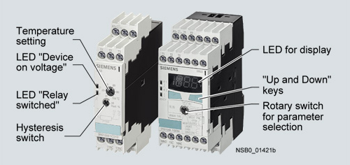 Реле контроля температуры SIMIREL 3RS10/3RS11 могут применяться для измерения температуры в твердых, жидких и газообразных средах. Температура измеряется датчиком в среде и обрабатывается реле, которое контролирует превышение верхней или нижней границы рабочего диапазона, а также удерживает уставки в пределах заданного диапазона (функция окна). Семейство состоит из аналоговых регулируемых аппаратов с одним или двумя пороговыми значениями, цифровых аппаратов согласно DIN 3440, представляющих хорошую альтернативу регуляторам температуры в секторе экономичного оборудования, и цифровых аппаратов, имеющих до 3 датчиков, оптимизированных для контроля крупных двигателей.