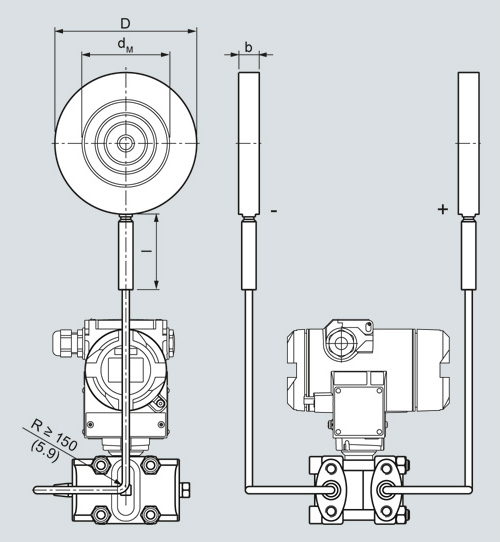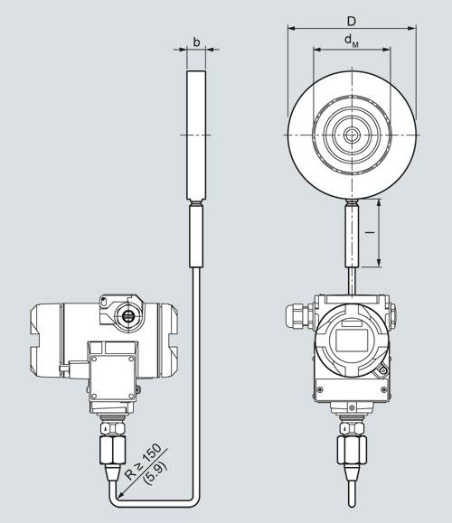 Diaphragm seals of sandwich design (without flange) with flexible capillary for connection to SITRANS P pressure transmitters for absolute pressure or differential pressure and flow, dimensions in mm (inch)