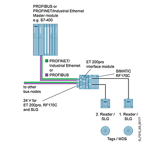 RF170C - это коммуникационный модуль для подключения RFID-систем фирмы Siemens к системе децентрализованной периферии ET 200pro. Считывающие устройства (SLG) всех RFID-систем могут работать на RF170C.