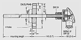 Фланцевый термометр сопротивления с соединительной головкой, размеры в мм (дюймах)