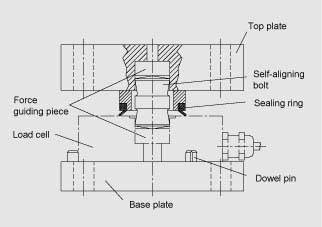 ДизайнКачающаяся опора состоит из подвижной стойки, головной плиты (верхняя часть опоры) и плиты основания (нижняя часть опоры). Самоцентрирующаяся подвижная опора позволяет головной плите и, соответственно, несущей конструкции следовать горизонтальным отклонениям (например, при колебаниях температуры). Конструкция стойки создает противодействующую силу, которая зависит от величины отклонения и приложенной нагрузки. Весоизмерительная ячейка не входит в объем поставки. Принципиальная схема Качающаяся опора для весоизмерительных ячеек серии RN |