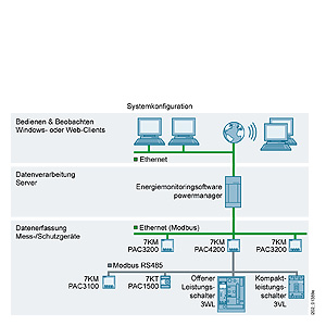 Система управления электроэнергией из линейки SENTRON состоит из ПК с установленным программным обеспечением и соответствующих измерительных устройств подключенных непосредственно к ПК посредством технологии Ethernet. Благодаря возможности учета энергопотребления в каждый момент времени система управления электроэнергией обеспечивает следующие основные преимущества:• определение возможности энергосбережения;• уменьшение стоимости электроэнергии;• обеспечение бесперебойности электроснабжения;Программное обеспечение для управления электроэнергией SENTRON powermanager это • Независимое программное обеспечение• Функционирует с использованием ПК и измерительных инструментов с возможностью подключения к Ethernet• Существует возможность расширения от стандартного приложения до полноценного гибкого решения для клиента• Полностью масштабируемая в соответствии с числом измерительных устройств и функционалом программного обеспечения.Оптимальная интеграция с измерительными приборами серии SENTRON PAC, а также автоматическими выключателями линейки SENTRON 3WL/3VL.SENTRON powermanager разработан для:• сбора• мониторинга• обработки• представления• архивацииданных полученных от приборов контроля электроэнергии SENTRON PAC3100, PAC3200 и PAC4200, автоматических выключателей SENTRON 3WL/3VL, а также любых других Modbus-совместимых приборов.Опциональные пакеты «Эксперт» и «Web»Стандартный пакет SENTRON powermanager содержит все необходимо для того чтобы покрыть стандартные условия применения. Стандартный пакет предоставляет пользователю возможность считанные данные передавать на внешние устройства, представлять в необходимом виде, архивировать и проводить базовые вычисления. Пакет «Эксперт» предоставляет пользователю максимальную гибкость для представления информации в графическом виде (например в виде линейных схем) в том числе интеграцию пользовательских изображений и устройств. Данные и пиктограммы приведены к стандартному интерфейсу Windows. Пакет «Web» предлагает возможность представлять данные для Internet.