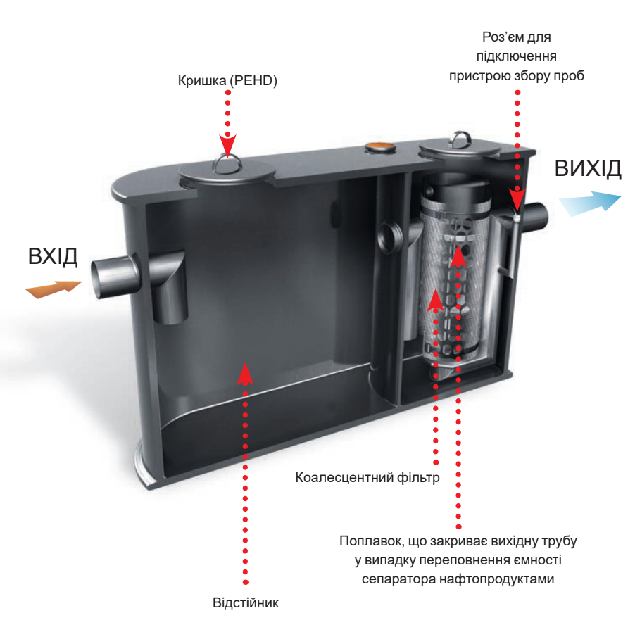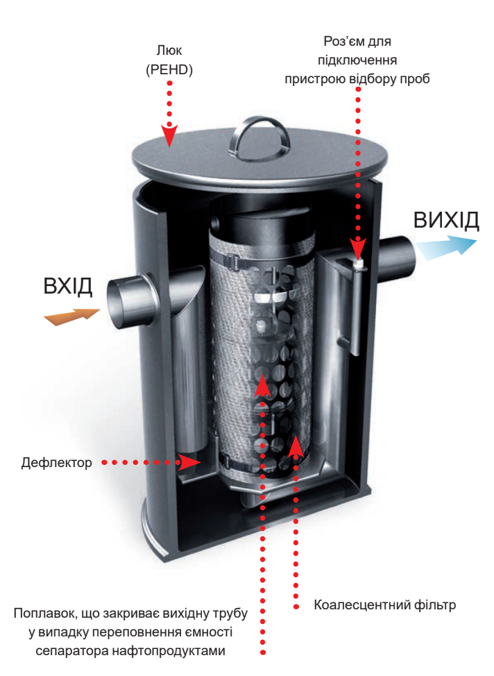 встроенным в сепаратор или устанавливаться отдельно. Очистка стоков от нефтепродуктов происходит в сепарационной части. Крупные частицы нефтепродуктов выплывают на поверхность через разницу плотности жидкости. В то же время мелкие частицы откладываются на поверхности коалесцентного фильтра, где они накапливаются до достижения определенного объема, при котором свободно поднимаются на поверхность.