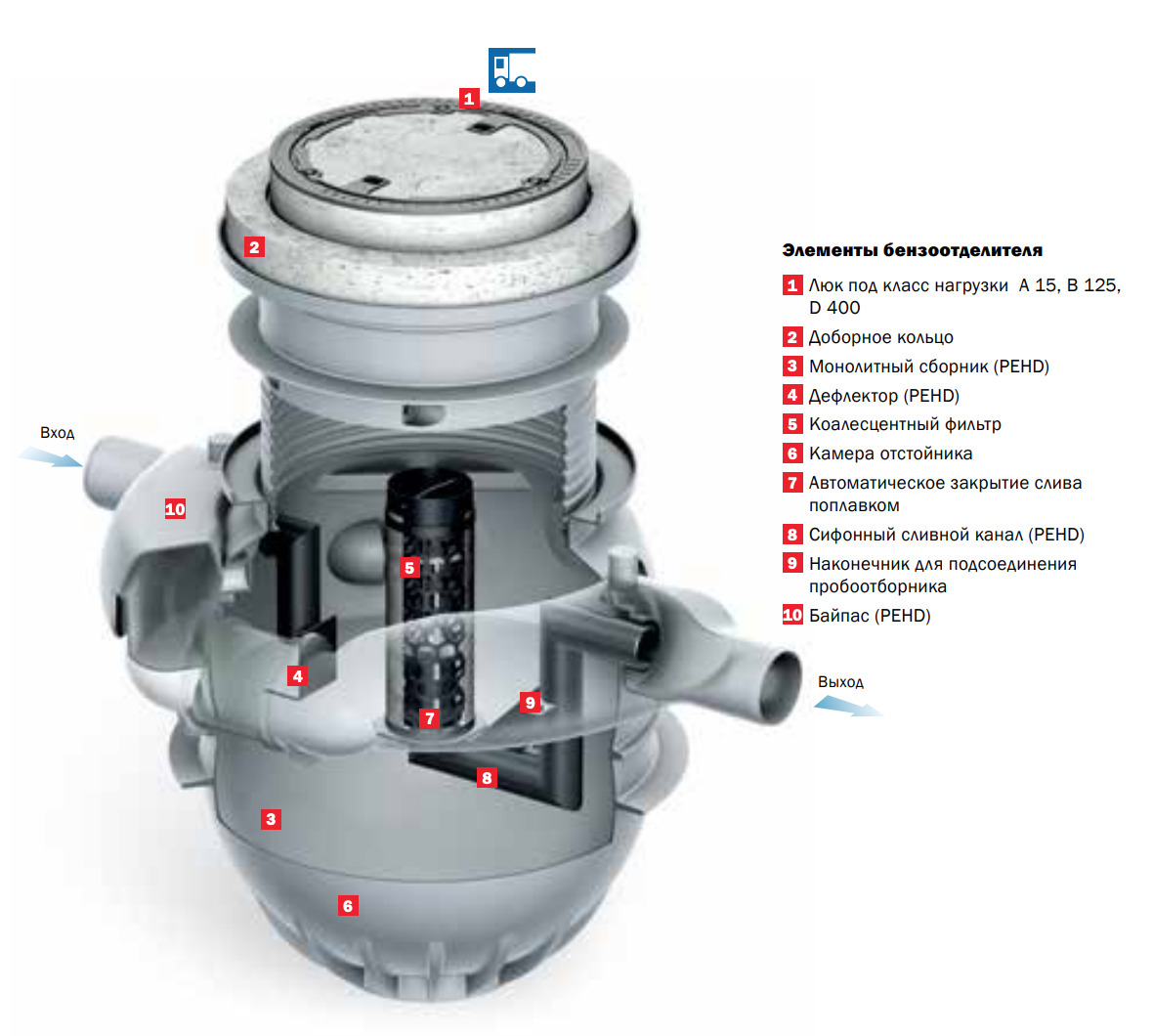 - Люк (PEHD) 1-2 штуки Вход, выход (PEHD) На входном отверстии дополнительно смонтирован дефлектор который обеспечивает стабилизации течения стоков на входе.