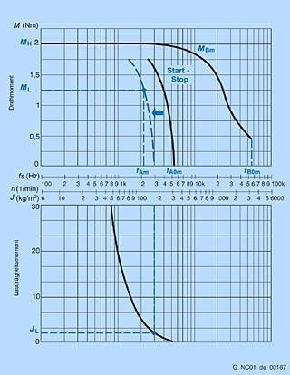 Старт-стопная характеристика разграничивает диапазон запуска. Без нагрузки двигатель может быть запущен с максимальной стартовой частотой fA0m. Актуально возможная стартовая частота f Am зависит от нагрузки и определяется параллельным переносом старт-стопной характеристики в сторону меньшей управляющей частоты в зависимости от существующей внешней инерции масс JL. Пример характеристики для двигателя 1FL3041показан синим цветом.