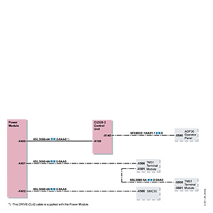 Коммуникация между блоком управления CU320, силовым модулем и другими активными компонентами SINAMICS происходит через DRIVE-CLiQ - внутренний последовательный интерфейс двигателя. Для этого доступны заранее смонтированные кабели.