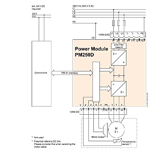 Силовой модуль PM250D обладает абсолютно уникальной технологией, которая называется "Технология эффективного питания". Регенеративная способность модуля PM250D в генераторном режиме (электронное торможение) означает, что энергия возвращается в сеть, а не рассеивается в тормозном резисторе. Это сохраняет место в шкафу у правления. Так же экономится время на расчет тормозного резистора и его подключение. Температура в шкафу управления так же не увеличивается при торможении.Инновационные схемотехнические решения, использованные при разработке Технологии эффективного питания, уменьшают влияние высших гармоник на питающую сеть. Нет необходимости использовать дополнительный сетевой дроссель. Это сохраняет пространство и деньги при проектировании и закупках оборудования.Силовой модуль PM250D так же подходит для решений с высокими требованиями к безопасности. Совместно с безопасным модулем управления (Fail-safe Control Unit), привод может быть превращен из обычного привода, в привод с интегрированными функциями безопасности Safety Integrated Drive (см. модули управления).
