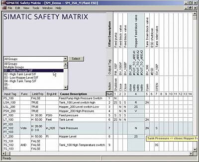 Программный продукт Safety Matrix расчитан на технологии, в которых необходимо иметь определенные функции безопасности. Safety Matrix базируется на проверенном принципе причинно-следственных связей, в котором возможно четко определить реакцию(следствие) системы на любую ошибку(причину), возникшую в технологическом процессе. После определения входных и выходных сигналов причин и следствий и параметров их взаимосвязи Safety Matrix автоматически генерирует CFC программу безопасности в шаблоне системы SIMATIC PCS 7. По сравнению с традиционным программированием, создание логики безопасености с помощью Safety Matrix проходит гораздо быстрее и существенно снижает затраты на разработку таких приложений. Работа с Safety Matrix не требует специальных навыков программирования и полность направлена на обеспечение функций безопасности. Если требуется, можно создавать несколько матриц безопасности и определять связи между ними. | |||||||||||||||