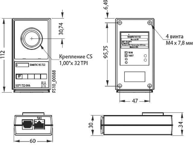 ДизайнВидео датчики SIMATIC VS720 выпускаются в компактных корпусах размером 112 х 60 х 30 мм без учета размеров объектива. В корпус датчика ввинчивается объектив типа CS или C. При этом для объектива типа C используется специальный адаптер. Особенности: - Встроенный контроль до 4-ех систем освещения
