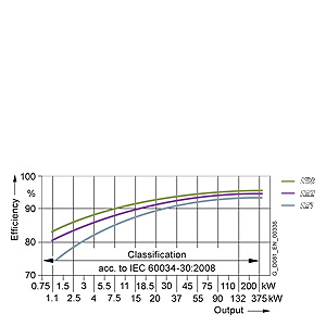 Для той же высоты вала высокопроизводительные двигатели предлагают более высокую выходную мощность. Повышение энергоэффектиновсти реализуется и здесь. Двигатели предлагаются (в зависимости от категории IEC 60034-30) в различных классах эффективности.