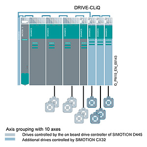 Решения в области автоматизации с множеством осей могут быть реализованы на базе SIMOTION D и CX32. SIMOTION D может управлять до 64 осями и имеет уже встроенный модуль питания и привод для управления 6 серво осями . Так же , могут использоваться векторный и V/f законы управления. Управление дополнительными 6 серво осями может быть реализовано на базе модуля SIMOTION CX32. Несколько модулей SIMOTION CX32 могут использоваться для одной группы осей.