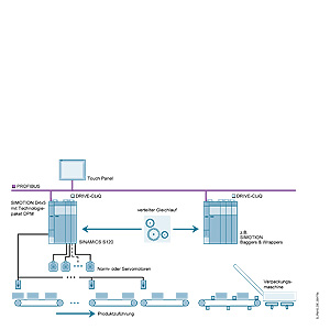 PROFIBUS DP или PROFINET IO используются изохронно для связи с оборудованием для упаковки, а также для "распределенного синхронного функционирования".