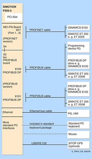 ДизайнSIMOTION P350 - это промышленный ПК, который включат в себя следующие интерфейсы: - 1 x плата IsoPROFIBUS с двумя изохронными PROFIBUS DP интерфейсами для соединения:
