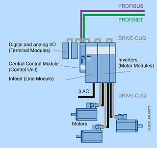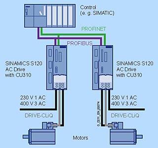 Полностью интегрированная автоматизация – уникальная платформа автоматизацииБлагодаря Полностью интегрированной автоматизации (TIA), Siemens является единственным поставщиком, предлагающим ассортимент интегрированной продукции и систем для всех секторов. Измененные в соответствиями с требованиями отдельных клиентов, решения автоматизации, отвечающие требованиям определенных секторов, могут быть эффективно реализованы на основе TIA. Более низкие затраты на срок эксплуатации на заводе и значительное снижение срока выпуска на рынок позволяют достичь значительных усовершенствований в области производительности и более высокой степени защиты вложений. Просто – полностью интегрированная автоматизация благодаря SINAMICS S120 Помимо SIMATIC, SIMOTION и SINUMERIK, SINAMICS являются основными компонентами TIA. Средство STARTER является неотъемлемым компонентом платформы TIA. Если поддерживается возможность параметризации, рекомендуется выполнить для программы и всех компонентов системы автоматизации используя платформу технических разработок. Функции управления данными на всех уровнях гарантируют непротиворечивость данных и упрощают архивацию всего проекта. PROFIBUS – шина No. 1 PROFIBUS DP, стандартная шина системы TIA поддерживается во всех вариантах SINAMICS S120, Обеспечивает высокопроизводительную сеть, функционирующую на всех уровнях системы, связывающую все компоненты автоматизации: HMI, элементы управления, приводы и устройства ввода-вывода. PROFINET – для более высокой производительности и открытой IT-связи SINAMICS S120 также доступен с PROFINET-интерфейсом. Эта шина с поддержкой Ethernet обеспечивает возможность высокоскоростной передачи данных управления с использованием PROFINET IO с IRT или RT, благодаря чему SINAMICS S120 является идеальным решением для интеграции в высокопроизводительных многоосных приложениях. Компоненты системы приводов SINAMICS S120