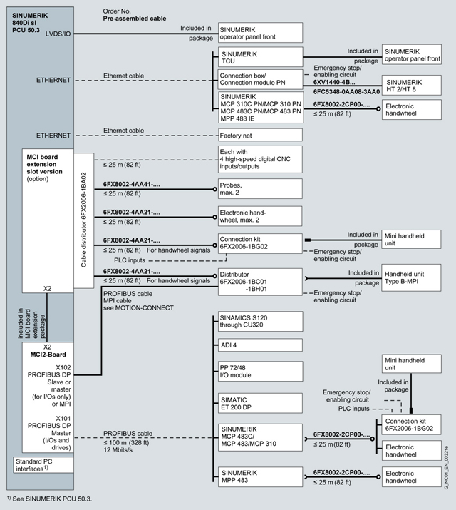 SINUMERIK 840Disl состоит из промышленного компьютера PCU 50.3, панели  MCI2 и системного программного обеспечения для 6 или 20 осей. Интерфейс PROFIBUS DP на панели MCI2 обеспечивает соединение приводной системы SINAMICS S120 и периферии SIMATIC DP ET 200. PROFIBUS DP с MotionControl (изохронный режим, эквидистантный) работает на скорости передачи 12 Мбит/с.