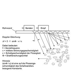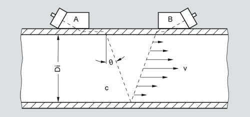 Звуковые волны, распространяющиеся в направлении движения потока (TA,B) поступают раньше, чем звуковые волны, распространяющиеся в противоположном направлении (TB,A). Эта разница во времени (Dt) используется для вычисления линейно интегрированной скорости потока (v), как показано в следующем уравнении: