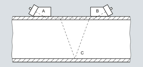 При установке преобразователей WideBeam в режиме отражения (“Reflect”) в показанной ниже конфигурации, звуковой сигнал распространяется по двум различным путям между преобразователями A и B. Один путь “ACB” проходит через стенку трубы и жидкость, тогда как путь “AB” не проходит через текучую среду.