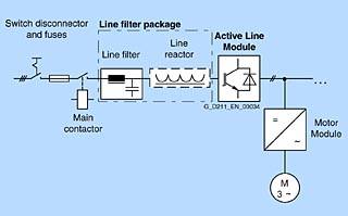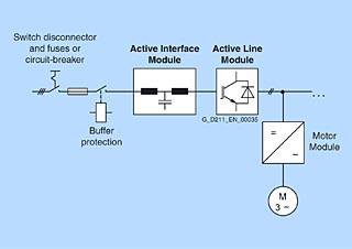 Активные линейные модули Активные линейные модули могут передавать энергию и возвращать регенеративную энергию в систему питания. Модуль торможения и тормозной резистор необходимы только в тех случаях, когда приводы необходимо контролируемо замедлить после перерыва в подаче энергии (например, когда энергия не может быть восстановлена на источнике питания). В отличие от базовых линейных модулей и интеллектуальных линейных модулей, активные линейные модули генерируют регулируемое напряжение постоянного тока, которое остается постоянным независимо от скачков напряжения в сети. В этом случае напряжение в не должно превышать допустимых пределов допустимых значений. Активные линейные модули получают виртуально синусоидальный ток от источника, что ограничивает наличие всех вредных гармонических колебаний. Активные линейные модули в блоковом формате Если активные линейные модули используются для подачи энергии, необходимо установить соответствующий линейный реактор. Для минимизации помех активные линейные модули всегда следует использовать совместно с линейным фильтром и линейным реактором.