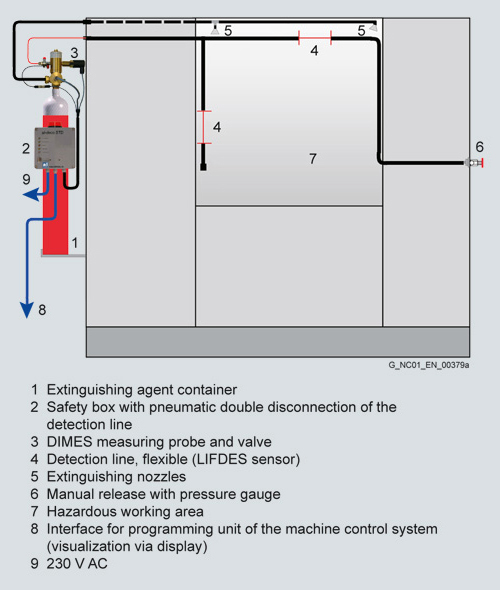 Для определения возгорания и процесса тушения система пожаротушения Sinorix al−deco использует пневматические функции. Поэтому система может определять и тушить возгорания без использования электроэнергии.Особые требования к станку, к примеру, сжатый воздух, управляющие сигналы или критерии сигнализации отсутствуют.